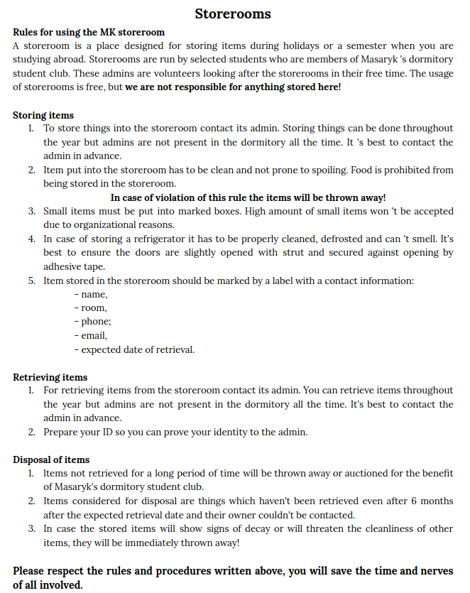 The members of our club accommodated at the Masaryk dormitory, that have a reservation on the next semester, but are not staying at the dormitory during summer holidays, may store their things at storerooms. The capacity of storerooms is limited, therefore we ask you, to store only necessary things.